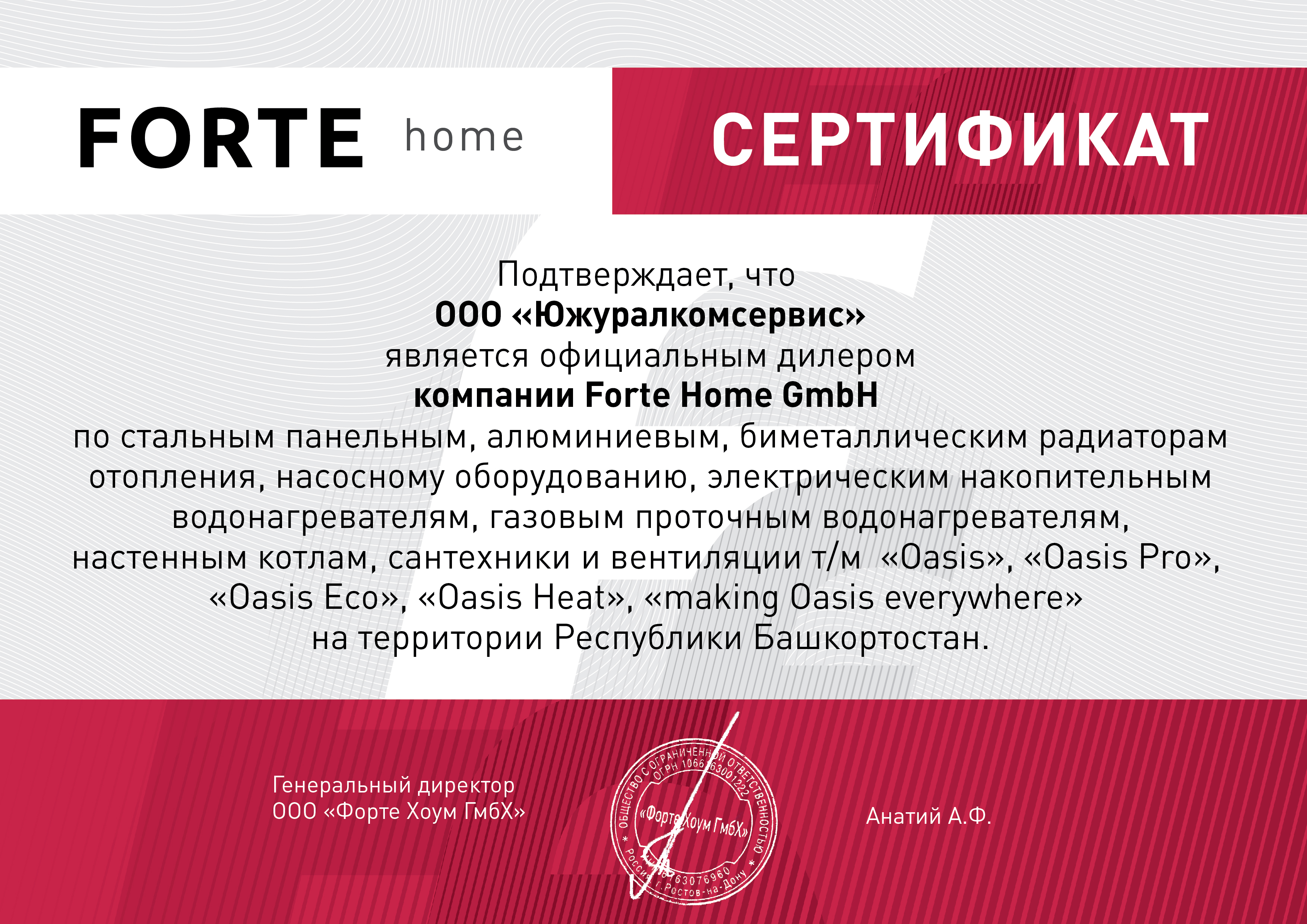 Дилерский сертификат - официальный документ, который выдает производитель. Он подтверждает, что наша компания является сертифицированным дистрибутором изготавливаемой им продукции