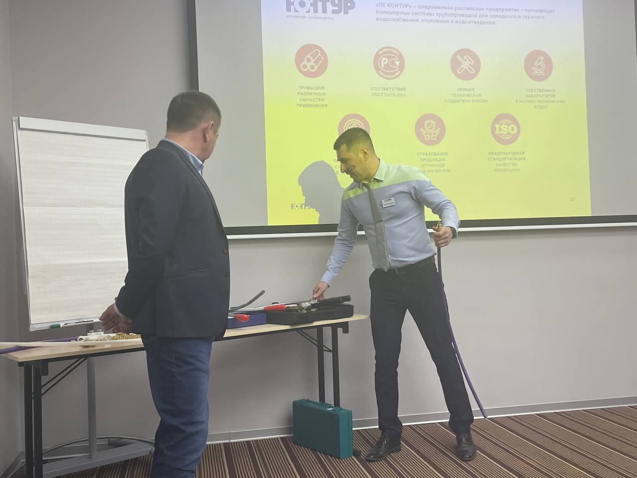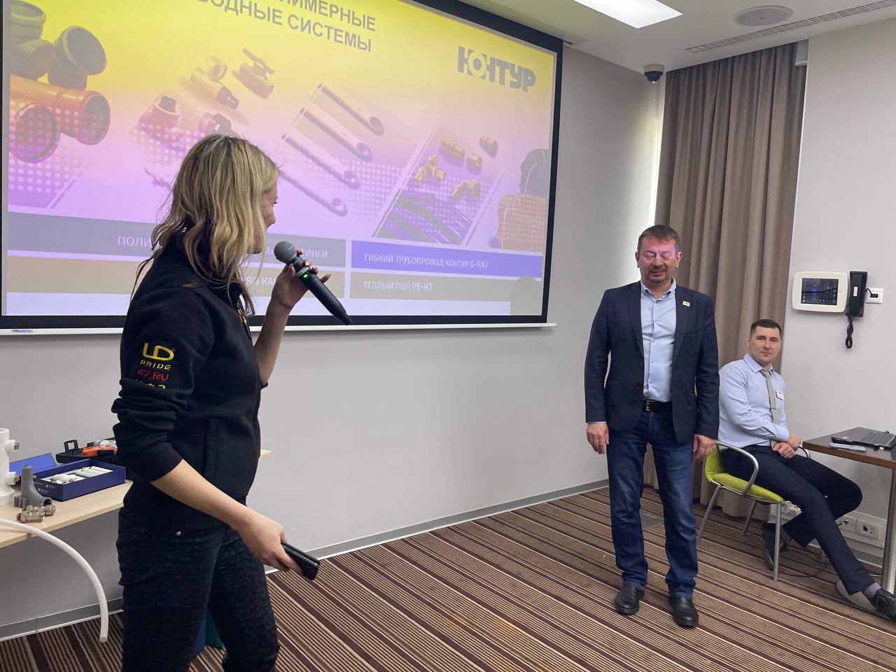 Вторая часть мероприятия началась с выступления представителей завода по производству полипропиленовых труб и фитингов ПК Контур. Поговорили о системах ПП трубопроводов для холодного и горячего водоснабжения и канализации, о системах горизонтальной разводки PE-XA/PE-RT на примере материалов завода.