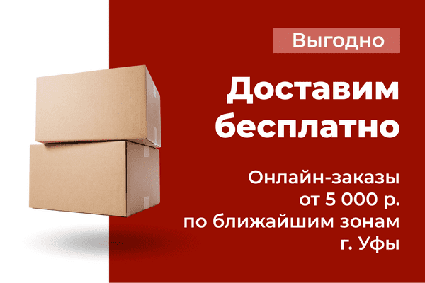 *Доставка товаров в пределах светло-зеленой и зеленой зон доставок включительно (карта зон) осуществляется бесплатно в срок до 3-х рабочих дней с даты согласования и оплаты заказа, при наличии товара на центральных складах в городе Уфа, весом менее 800 кг, габаритным размером не более 260 х 160 х 150 см. Доставка осуществляется до подъезда, подъем оплачивается отдельно.Акция не распространяется на металлопрокат. При доставке, выгрузка осуществляется собственными силами покупателя.